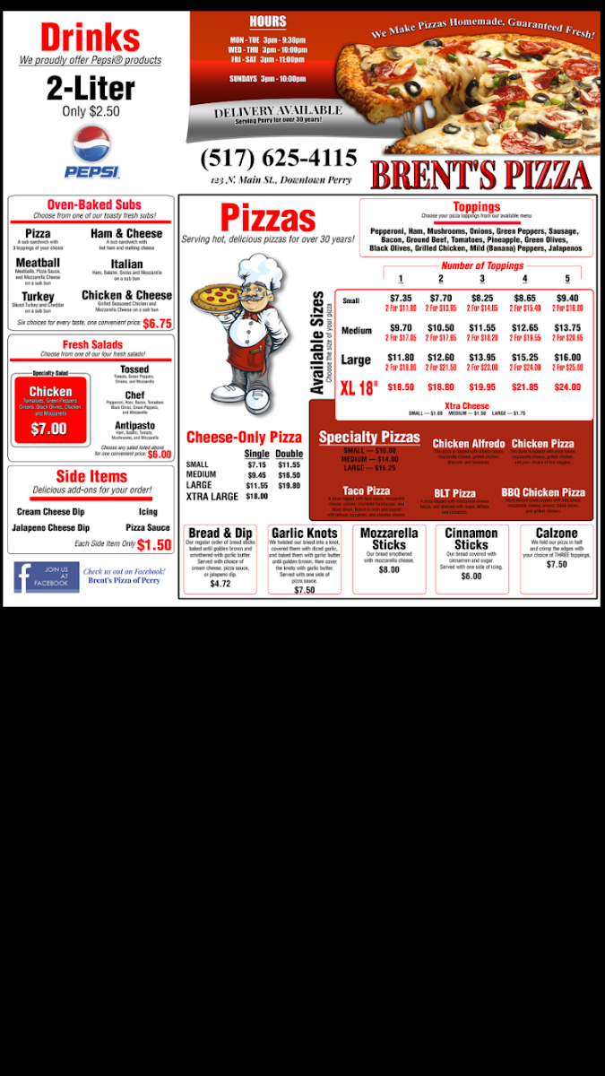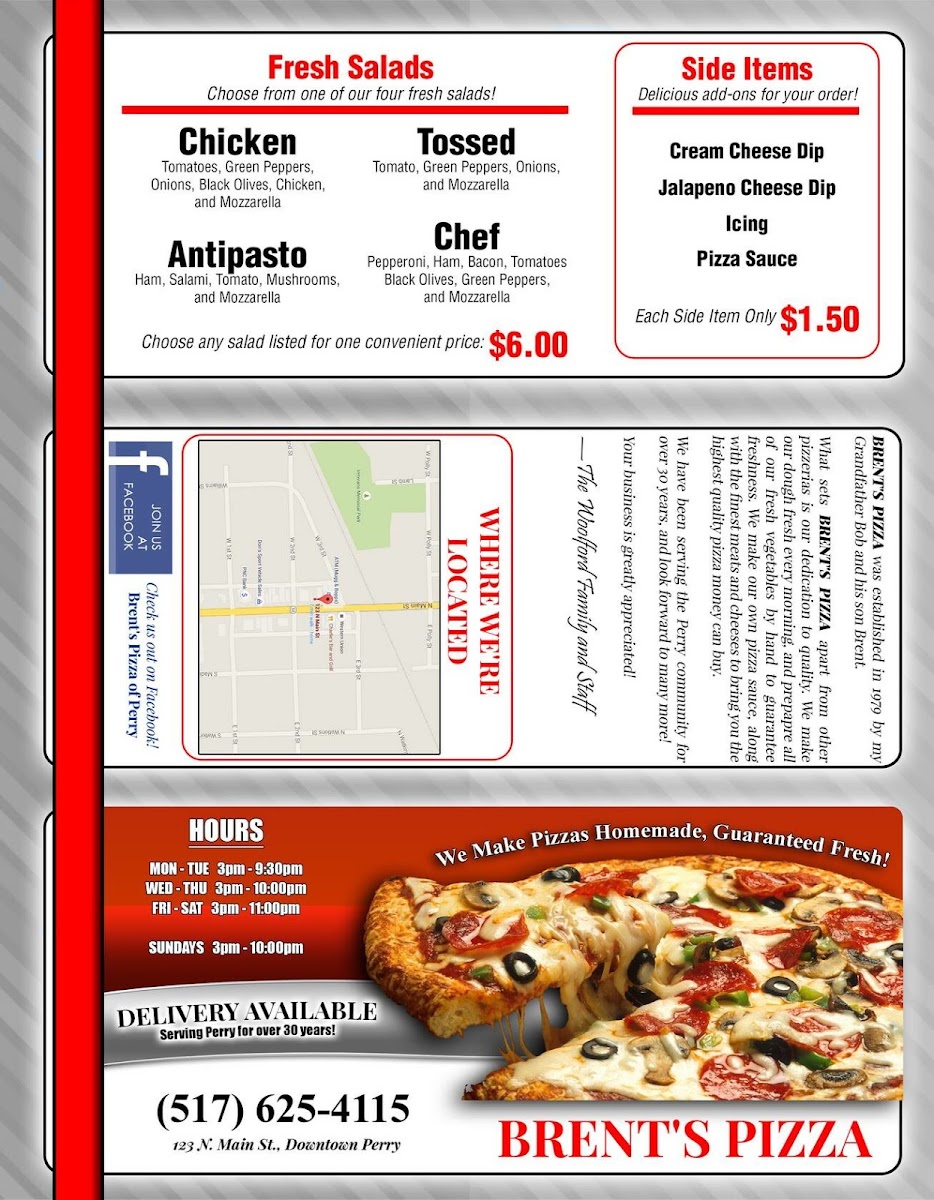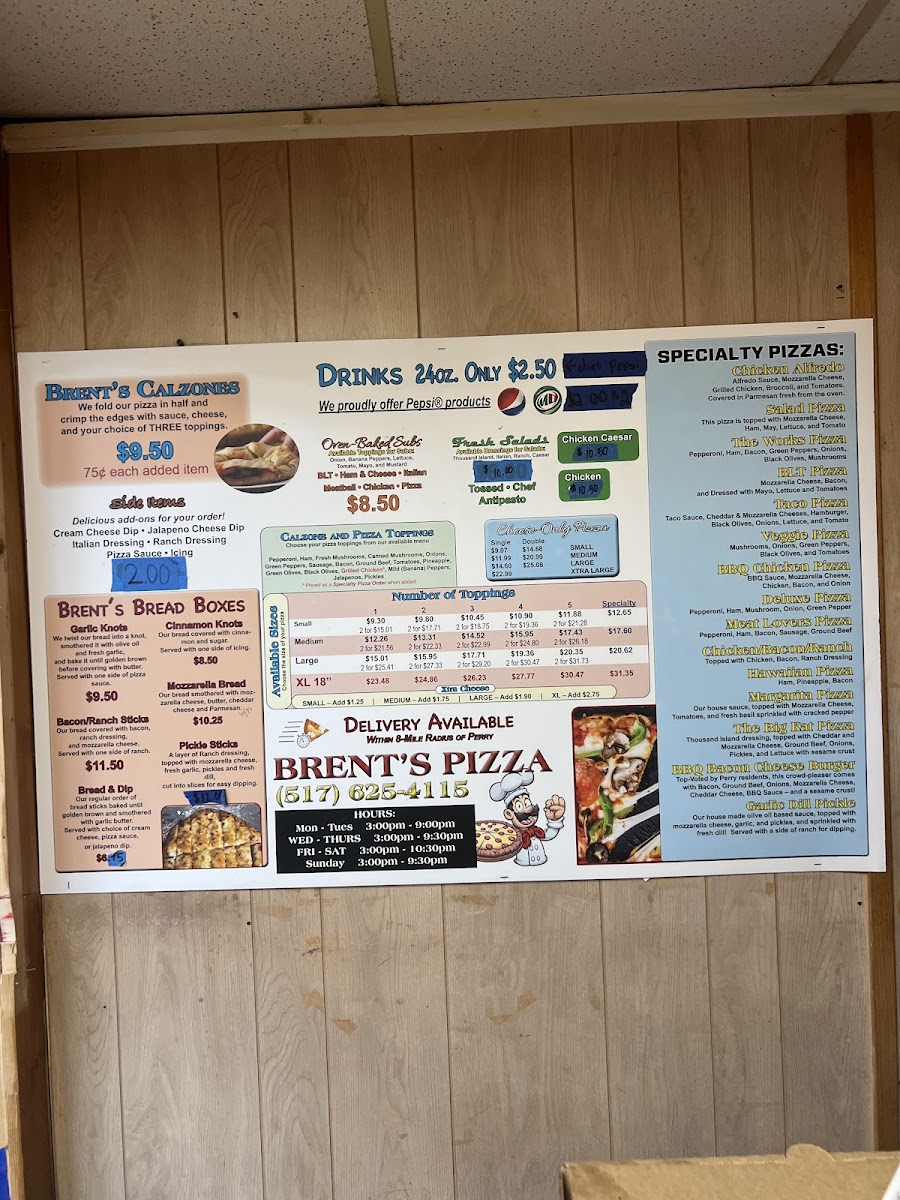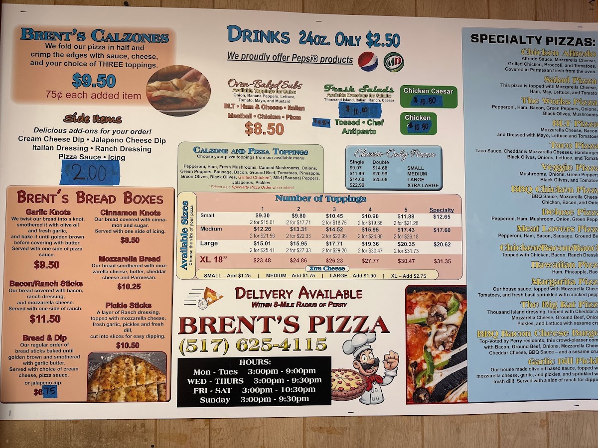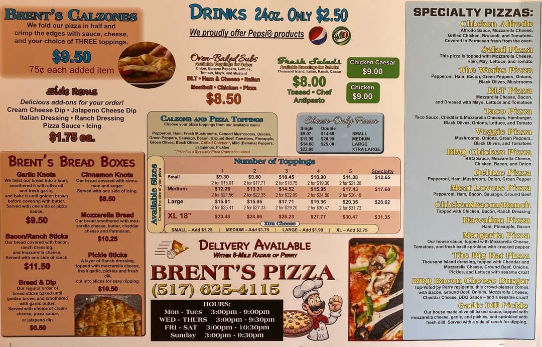 As a reviewer reflecting on the overall menu experience at Brent's Pizza Of Perry, located at 123 N Main St, Perry, MI 48872, the menu feels thoughtfully rounded and designed to satisfy a wide range of cravings. It starts strong with Brent’s Bread Boxes, featuring comforting starters like Garlic Knots, Bacon/Ranch Sticks, Bread & Dip, Cinnamon Knots, and Mozzarella Bread, which set the tone for a hearty, casual meal. The pizza selection stands out with Specialty Pizzas such as Chicken Alfredo, Salad Pizza, The Works Pizza, BLT Pizza, and Taco Pizza, offering both classic combinations and creative twists. For something more filling, the Oven-Baked Subs-including Pizza, Meatball, Turkey, Ham & Cheese, and Italian-add a satisfying baked option to the lineup. Lighter choices are well represented through Specialty Salad options like Chicken, along with Fresh Salads such as Tossed, Chef, and Antipasto, balancing indulgence with freshness. To complement the main dishes, Side Items like Cream Cheese Dip and Jalapeno Cheese Dip bring extra flavor, while the Others category-featuring Tossed, Chef, Antipasto, Chicken Caesar, Chicken, Mozzarella Sticks, and Cinnamon Sticks-rounds out the menu with familiar favorites. Altogether, the menu at Brent’s Pizza Of Perry feels cohesive and satisfying, making it easy to see why it appeals to both pizza lovers and diners looking for variety in a relaxed, local setting.